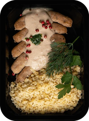 Куриные колбаски с луковым соусом